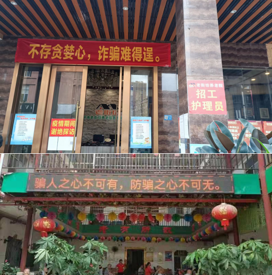 各养老机构通过横幅、LED显示屏宣传养老诈骗