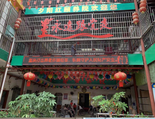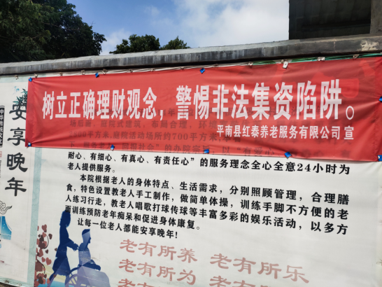 养老机构通过悬挂横幅、LED显示屏进行养老诈骗宣传