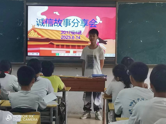 诚信是中华民族的优良传统,是为人之本,是建立相互信任关系的道德凭借,是衡量一个人品德修养状况和人格高下的重要标准,也是一名学生不可或缺的基本素质。根据实际情况,我校以班级为单位,开展了“人人知诚信、人人讲诚信”主题班会、诚信经典诵读活动、诚信故事会等活动,期末考试前开展了诚信考试主题班会,组织考生考前签订诚信考试承诺书。强化家校联动,鼓励家长和学生通过分享诚信故事带动家庭诚信美德建设。引导学生树立“说诚信话,办诚信事,做诚信人”的诚信观念,自觉加强诚信建设,养成诚信待人诚信处事,诚信学习,诚信立身的良好习惯,把学生培养成一名具有诚信美德、高素质的优秀少年。